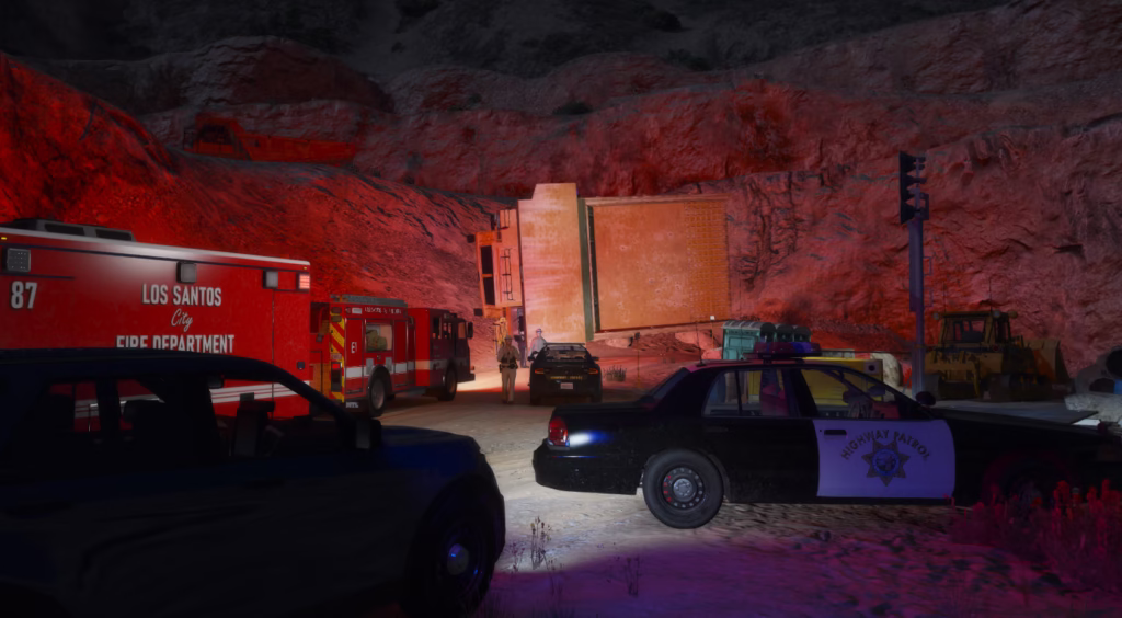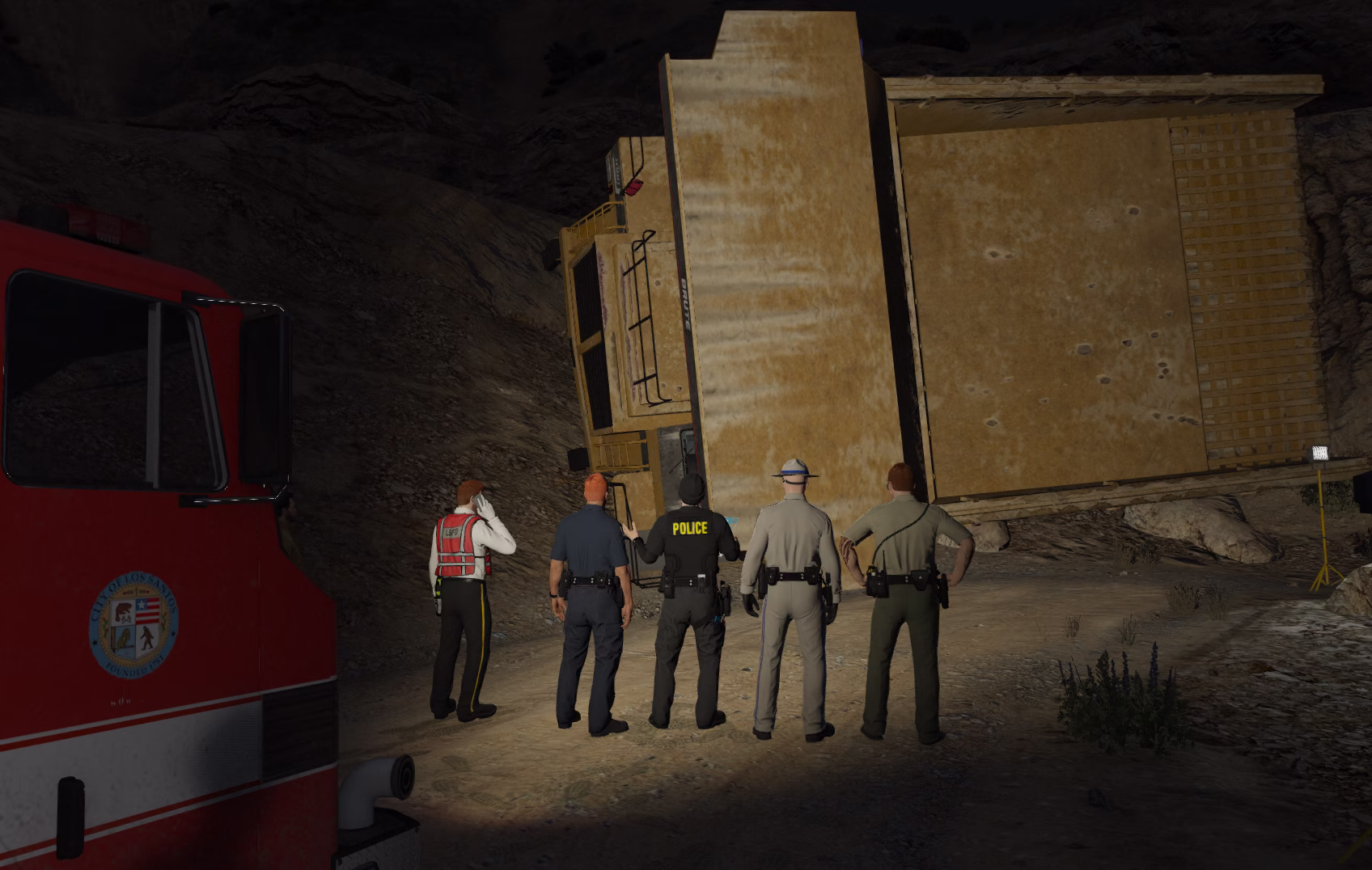 Die SAHP traf als erste Einheit am Einsatzort ein und konnte umgehend wichtige Informationen an das Los Santos Fire Department weitergeben. Der Muldenkipper war aus einer geschätzten Höhe von 30 Metern in die Tiefe gestürzt und lag seitlich.